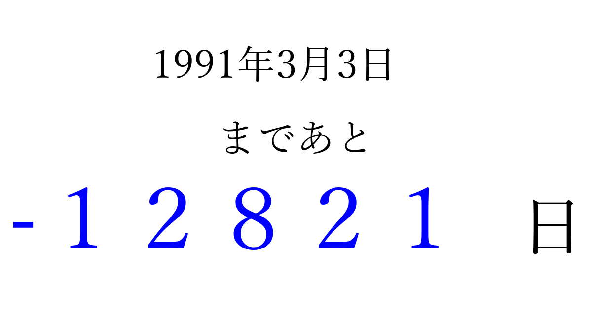 1991年3月3日(日)は もう 00000 日過ぎました 追加すると、トップページからすぐ選べるようになります ※2026/04/09現在の結果です。 最新の状態に更新する ↓シェアして、タイムライン上にカウントダウンを表示しよう!↓ 📤 この結果を共有する Tweet シェア Threads Bluesky 別の日付でカウントダウン 1991年3月のカレンダー このページをブックマークに追加すると、いつでもカウントダウンを確認できます。 (PC: Ctrl+D / Mac: ⌘+D) hitome-notes.comでは以下のページも運営しています。 指定日と期間から日付を計算 | ガチャ確率計算・シミュレーション | プライバシー・ポリシー 運営者:Avocado