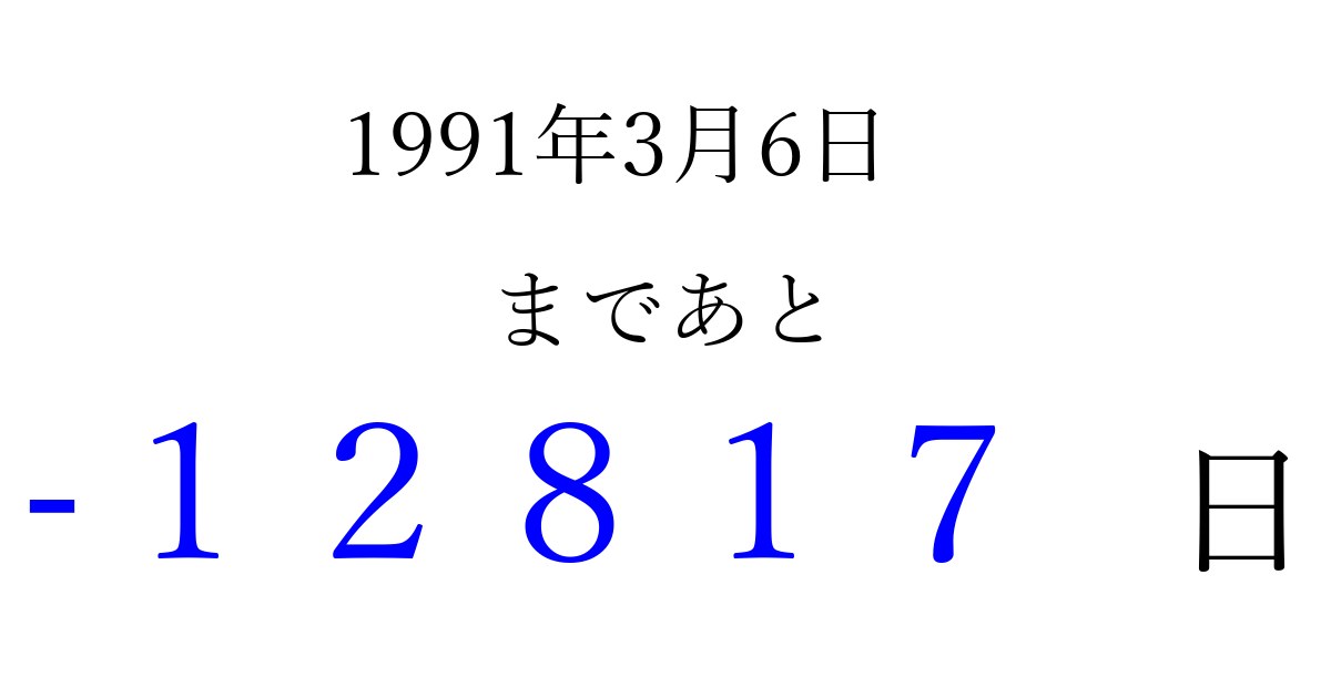 1991年3月6日(水)は もう 00000 日過ぎました 追加すると、トップページからすぐ選べるようになります ※2026/04/08現在の結果です。 最新の状態に更新する ↓シェアして、タイムライン上にカウントダウンを表示しよう!↓ 📤 この結果を共有する Tweet シェア Threads Bluesky 別の日付でカウントダウン 1991年3月のカレンダー このページをブックマークに追加すると、いつでもカウントダウンを確認できます。 (PC: Ctrl+D / Mac: ⌘+D) hitome-notes.comでは以下のページも運営しています。 指定日と期間から日付を計算 | ガチャ確率計算・シミュレーション | プライバシー・ポリシー 運営者:Avocado