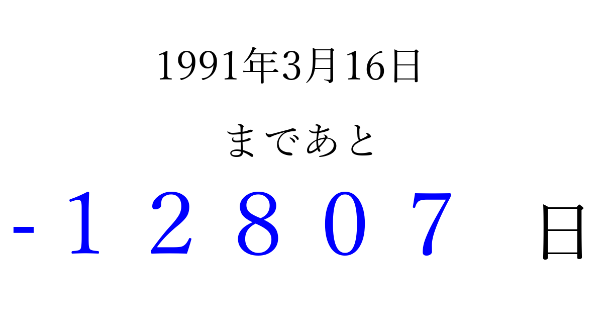 1991年3月16日(土)は もう 00000 日過ぎました 追加すると、トップページからすぐ選べるようになります ※2026/04/08現在の結果です。 最新の状態に更新する ↓シェアして、タイムライン上にカウントダウンを表示しよう!↓ 📤 この結果を共有する Tweet シェア Threads Bluesky 別の日付でカウントダウン 1991年3月のカレンダー このページをブックマークに追加すると、いつでもカウントダウンを確認できます。 (PC: Ctrl+D / Mac: ⌘+D) hitome-notes.comでは以下のページも運営しています。 指定日と期間から日付を計算 | ガチャ確率計算・シミュレーション | プライバシー・ポリシー 運営者:Avocado