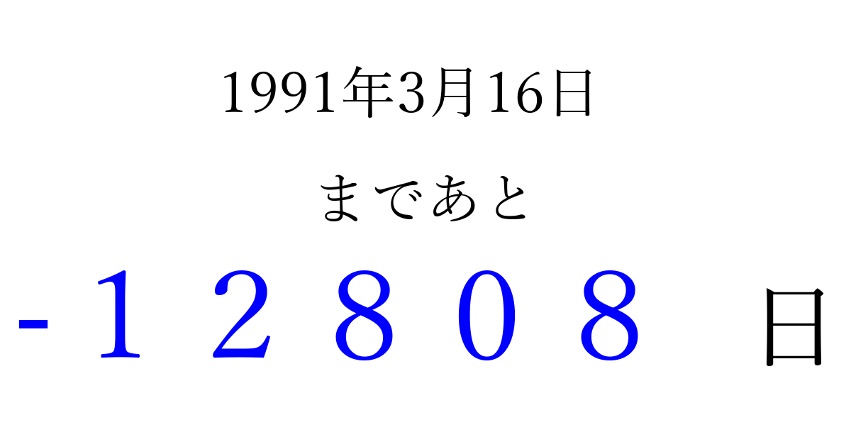 1991年3月16日(土)は もう 00000 日過ぎました 追加すると、トップページからすぐ選べるようになります ※2026/04/09現在の結果です。 最新の状態に更新する ↓シェアして、タイムライン上にカウントダウンを表示しよう!↓ 📤 この結果を共有する Tweet シェア Threads Bluesky 別の日付でカウントダウン 1991年3月のカレンダー このページをブックマークに追加すると、いつでもカウントダウンを確認できます。 (PC: Ctrl+D / Mac: ⌘+D) hitome-notes.comでは以下のページも運営しています。 指定日と期間から日付を計算 | ガチャ確率計算・シミュレーション | プライバシー・ポリシー 運営者:Avocado
