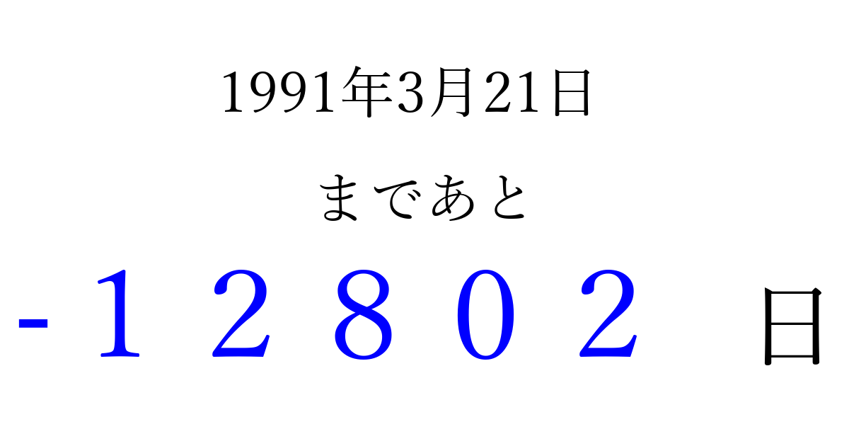 1991年3月21日(木)は もう 00000 日過ぎました 追加すると、トップページからすぐ選べるようになります ※2026/04/08現在の結果です。 最新の状態に更新する ↓シェアして、タイムライン上にカウントダウンを表示しよう!↓ 📤 この結果を共有する Tweet シェア Threads Bluesky 別の日付でカウントダウン 1991年3月のカレンダー このページをブックマークに追加すると、いつでもカウントダウンを確認できます。 (PC: Ctrl+D / Mac: ⌘+D) hitome-notes.comでは以下のページも運営しています。 指定日と期間から日付を計算 | ガチャ確率計算・シミュレーション | プライバシー・ポリシー 運営者:Avocado