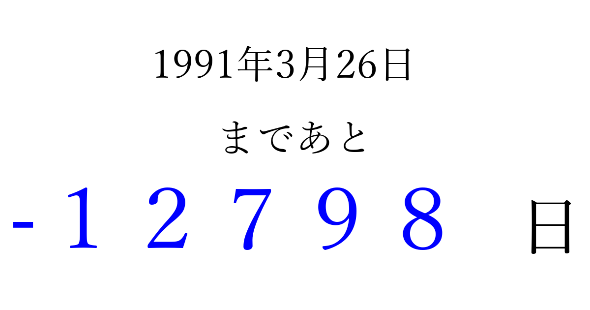 1991年3月26日(火)は もう 00000 日過ぎました 追加すると、トップページからすぐ選べるようになります ※2026/04/09現在の結果です。 最新の状態に更新する ↓シェアして、タイムライン上にカウントダウンを表示しよう!↓ 📤 この結果を共有する Tweet シェア Threads Bluesky 別の日付でカウントダウン 1991年3月のカレンダー このページをブックマークに追加すると、いつでもカウントダウンを確認できます。 (PC: Ctrl+D / Mac: ⌘+D) hitome-notes.comでは以下のページも運営しています。 指定日と期間から日付を計算 | ガチャ確率計算・シミュレーション | プライバシー・ポリシー 運営者:Avocado