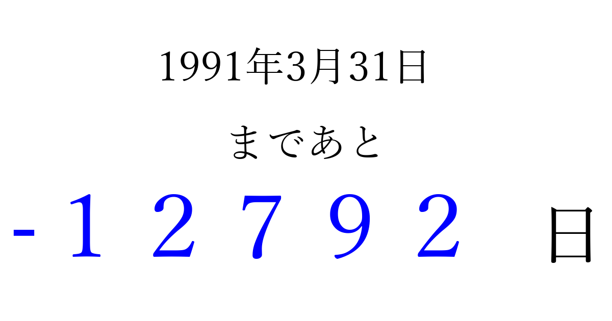 1991年3月31日(日)は もう 00000 日過ぎました 追加すると、トップページからすぐ選べるようになります ※2026/04/08現在の結果です。 最新の状態に更新する ↓シェアして、タイムライン上にカウントダウンを表示しよう!↓ 📤 この結果を共有する Tweet シェア Threads Bluesky 別の日付でカウントダウン 1991年3月のカレンダー このページをブックマークに追加すると、いつでもカウントダウンを確認できます。 (PC: Ctrl+D / Mac: ⌘+D) hitome-notes.comでは以下のページも運営しています。 指定日と期間から日付を計算 | ガチャ確率計算・シミュレーション | プライバシー・ポリシー 運営者:Avocado