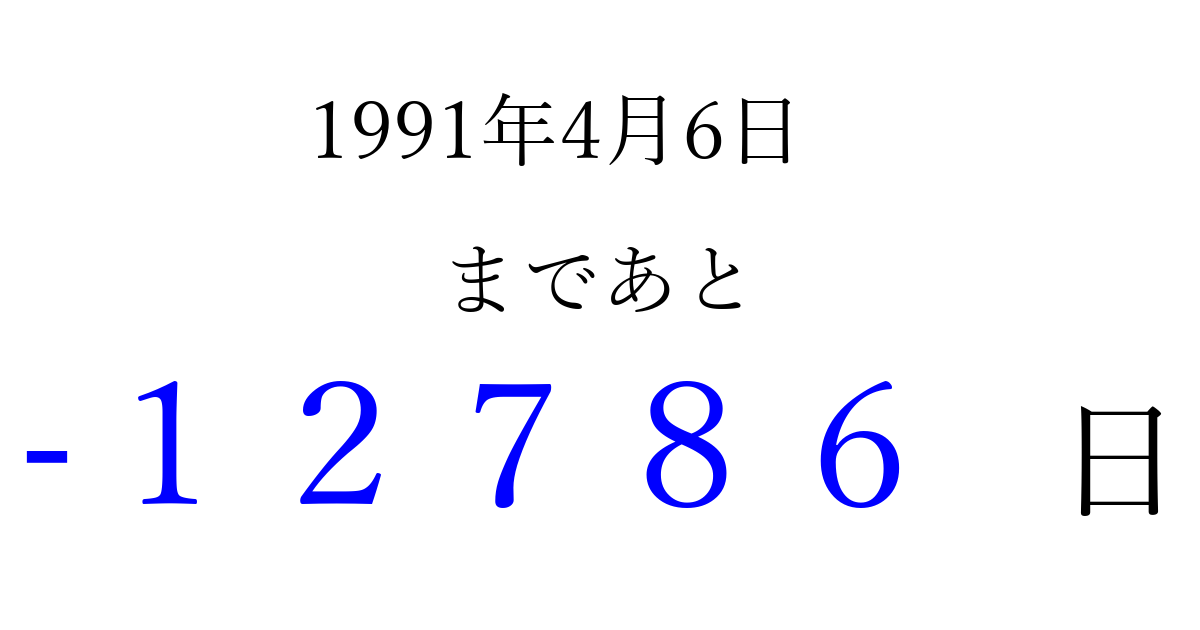 1991年4月6日(土)は もう 00000 日過ぎました 追加すると、トップページからすぐ選べるようになります ※2026/04/08現在の結果です。 最新の状態に更新する ↓シェアして、タイムライン上にカウントダウンを表示しよう!↓ 📤 この結果を共有する Tweet シェア Threads Bluesky 別の日付でカウントダウン 1991年4月のカレンダー このページをブックマークに追加すると、いつでもカウントダウンを確認できます。 (PC: Ctrl+D / Mac: ⌘+D) hitome-notes.comでは以下のページも運営しています。 指定日と期間から日付を計算 | ガチャ確率計算・シミュレーション | プライバシー・ポリシー 運営者:Avocado
