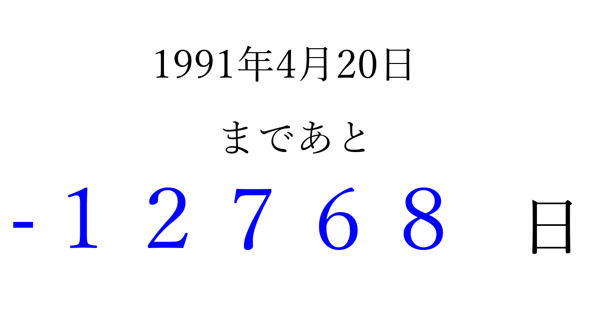 1991年4月20日(土)は もう 00000 日過ぎました 追加すると、トップページからすぐ選べるようになります ※2026/04/04現在の結果です。 最新の状態に更新する ↓シェアして、タイムライン上にカウントダウンを表示しよう!↓ 📤 この結果を共有する Tweet シェア Threads Bluesky 別の日付でカウントダウン 1991年4月のカレンダー このページをブックマークに追加すると、いつでもカウントダウンを確認できます。 (PC: Ctrl+D / Mac: ⌘+D) hitome-notes.comでは以下のページも運営しています。 指定日と期間から日付を計算 | ガチャ確率計算・シミュレーション | プライバシー・ポリシー 運営者:Avocado