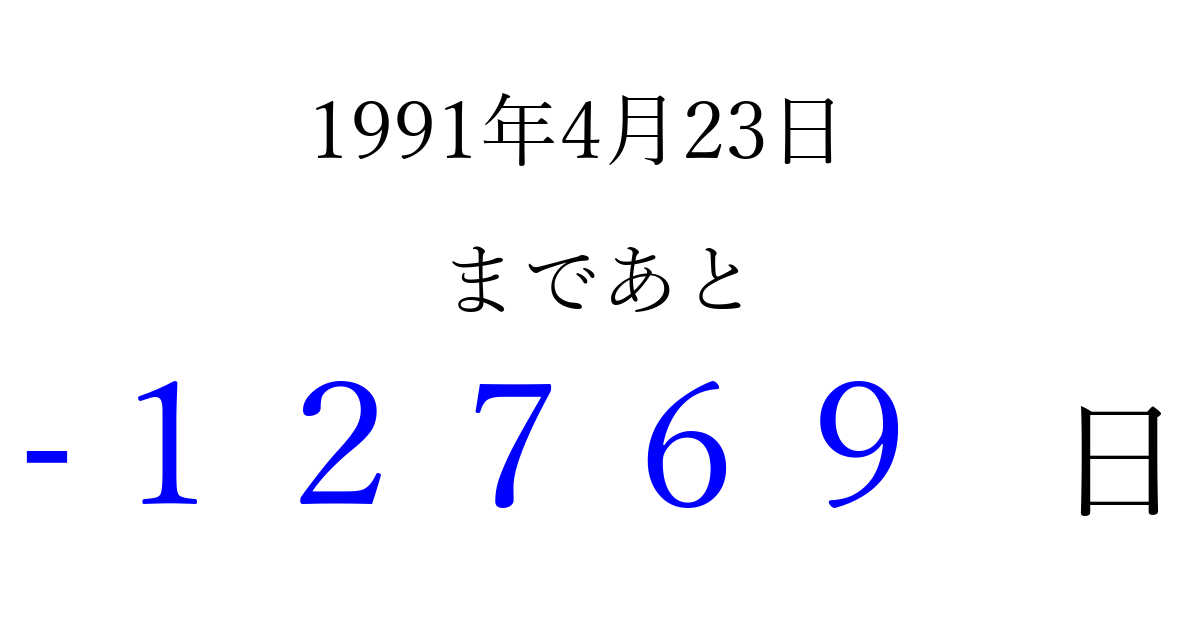 1991年4月23日(火)は もう 00000 日過ぎました 追加すると、トップページからすぐ選べるようになります ※2026/04/08現在の結果です。 最新の状態に更新する ↓シェアして、タイムライン上にカウントダウンを表示しよう!↓ 📤 この結果を共有する Tweet シェア Threads Bluesky 別の日付でカウントダウン 1991年4月のカレンダー このページをブックマークに追加すると、いつでもカウントダウンを確認できます。 (PC: Ctrl+D / Mac: ⌘+D) hitome-notes.comでは以下のページも運営しています。 指定日と期間から日付を計算 | ガチャ確率計算・シミュレーション | プライバシー・ポリシー 運営者:Avocado