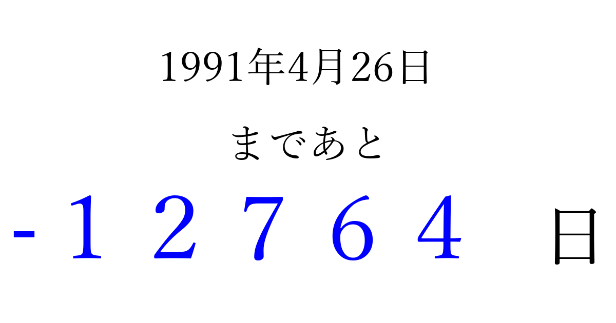 1991年4月26日(金)は もう 00000 日過ぎました 追加すると、トップページからすぐ選べるようになります ※2026/04/06現在の結果です。 最新の状態に更新する ↓シェアして、タイムライン上にカウントダウンを表示しよう!↓ 📤 この結果を共有する Tweet シェア Threads Bluesky 別の日付でカウントダウン 1991年4月のカレンダー このページをブックマークに追加すると、いつでもカウントダウンを確認できます。 (PC: Ctrl+D / Mac: ⌘+D) hitome-notes.comでは以下のページも運営しています。 指定日と期間から日付を計算 | ガチャ確率計算・シミュレーション | プライバシー・ポリシー 運営者:Avocado