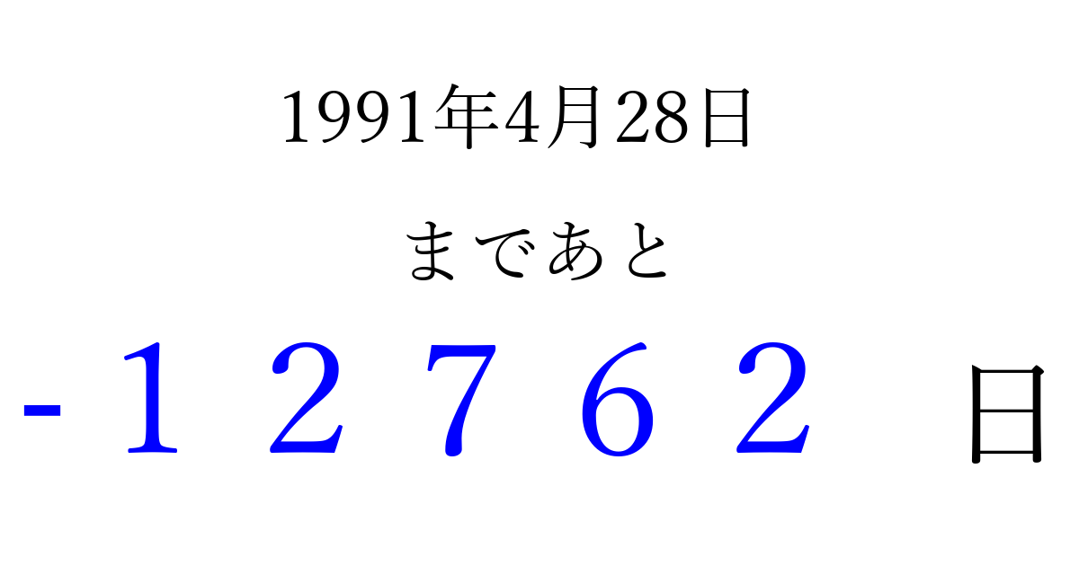1991年4月28日(日)は もう 00000 日過ぎました 追加すると、トップページからすぐ選べるようになります ※2026/04/06現在の結果です。 最新の状態に更新する ↓シェアして、タイムライン上にカウントダウンを表示しよう!↓ 📤 この結果を共有する Tweet シェア Threads Bluesky 別の日付でカウントダウン 1991年4月のカレンダー このページをブックマークに追加すると、いつでもカウントダウンを確認できます。 (PC: Ctrl+D / Mac: ⌘+D) hitome-notes.comでは以下のページも運営しています。 指定日と期間から日付を計算 | ガチャ確率計算・シミュレーション | プライバシー・ポリシー 運営者:Avocado