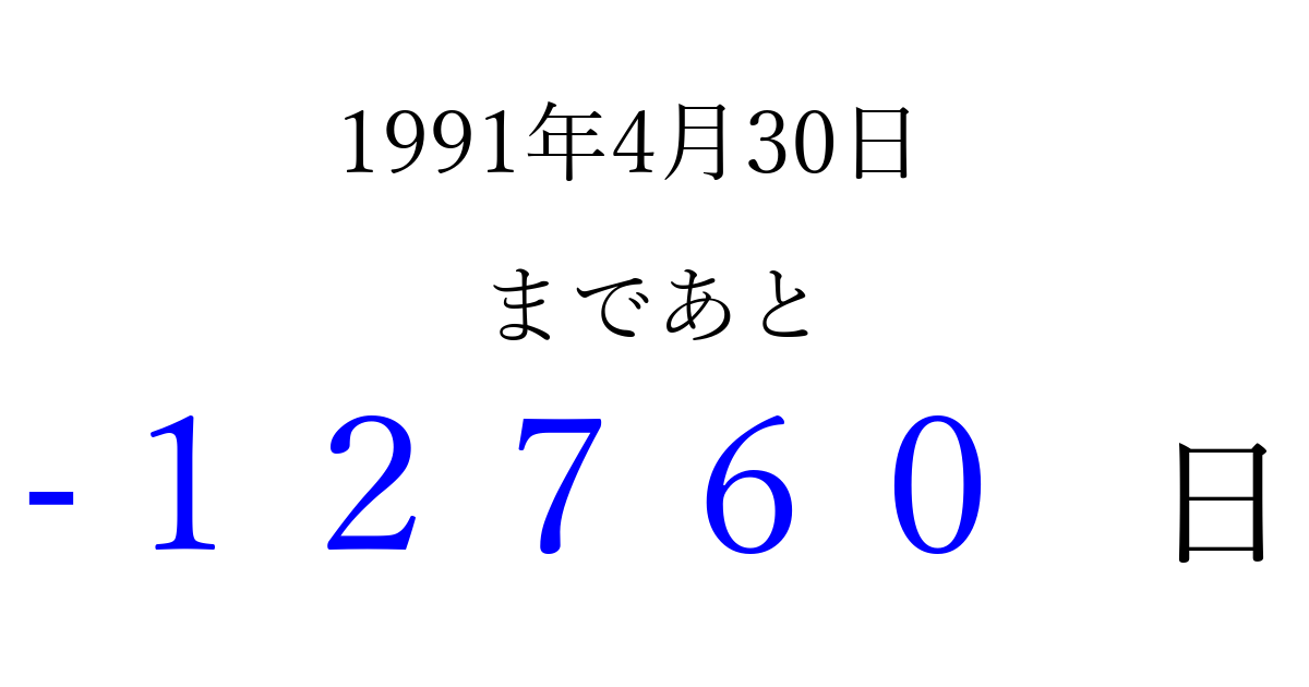 1991年4月30日(火)は もう 00000 日過ぎました 追加すると、トップページからすぐ選べるようになります ※2026/04/06現在の結果です。 最新の状態に更新する ↓シェアして、タイムライン上にカウントダウンを表示しよう!↓ 📤 この結果を共有する Tweet シェア Threads Bluesky 別の日付でカウントダウン 1991年4月のカレンダー このページをブックマークに追加すると、いつでもカウントダウンを確認できます。 (PC: Ctrl+D / Mac: ⌘+D) hitome-notes.comでは以下のページも運営しています。 指定日と期間から日付を計算 | ガチャ確率計算・シミュレーション | プライバシー・ポリシー 運営者:Avocado