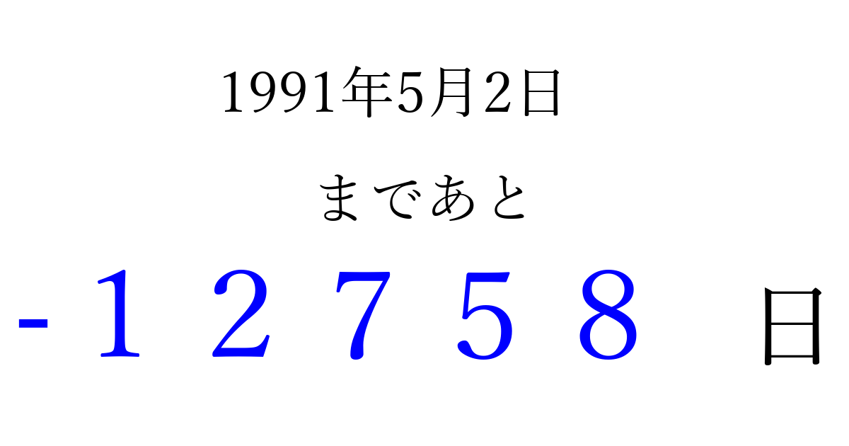 1991年5月2日(木)は もう 00000 日過ぎました 追加すると、トップページからすぐ選べるようになります ※2026/04/06現在の結果です。 最新の状態に更新する ↓シェアして、タイムライン上にカウントダウンを表示しよう!↓ 📤 この結果を共有する Tweet シェア Threads Bluesky 別の日付でカウントダウン 1991年5月のカレンダー このページをブックマークに追加すると、いつでもカウントダウンを確認できます。 (PC: Ctrl+D / Mac: ⌘+D) hitome-notes.comでは以下のページも運営しています。 指定日と期間から日付を計算 | ガチャ確率計算・シミュレーション | プライバシー・ポリシー 運営者:Avocado