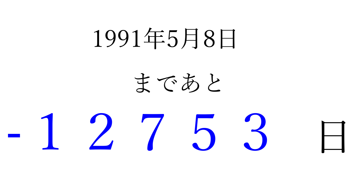 1991年5月8日(水)は もう 00000 日過ぎました 追加すると、トップページからすぐ選べるようになります ※2026/04/07現在の結果です。 最新の状態に更新する ↓シェアして、タイムライン上にカウントダウンを表示しよう!↓ 📤 この結果を共有する Tweet シェア Threads Bluesky 別の日付でカウントダウン 1991年5月のカレンダー このページをブックマークに追加すると、いつでもカウントダウンを確認できます。 (PC: Ctrl+D / Mac: ⌘+D) hitome-notes.comでは以下のページも運営しています。 指定日と期間から日付を計算 | ガチャ確率計算・シミュレーション | プライバシー・ポリシー 運営者:Avocado