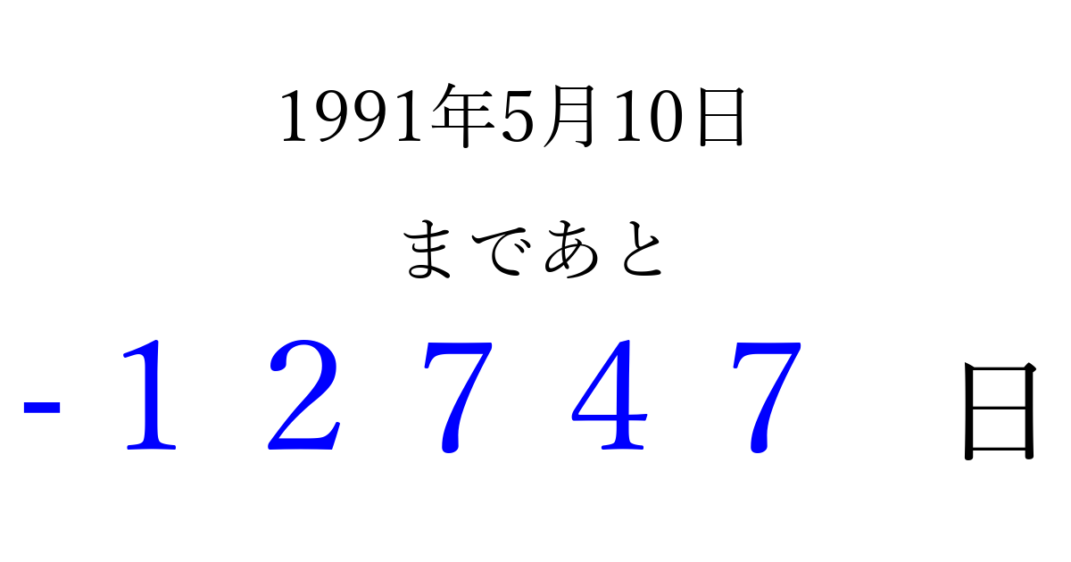 1991年5月10日(金)は もう 00000 日過ぎました 追加すると、トップページからすぐ選べるようになります ※2026/04/03現在の結果です。 最新の状態に更新する ↓シェアして、タイムライン上にカウントダウンを表示しよう!↓ 📤 この結果を共有する Tweet シェア Threads Bluesky 別の日付でカウントダウン 1991年5月のカレンダー このページをブックマークに追加すると、いつでもカウントダウンを確認できます。 (PC: Ctrl+D / Mac: ⌘+D) hitome-notes.comでは以下のページも運営しています。 指定日と期間から日付を計算 | ガチャ確率計算・シミュレーション | プライバシー・ポリシー 運営者:Avocado