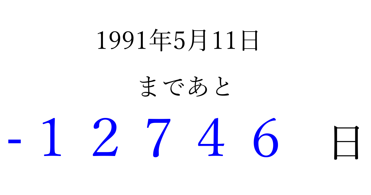 1991年5月11日(土)は もう 00000 日過ぎました 追加すると、トップページからすぐ選べるようになります ※2026/04/03現在の結果です。 最新の状態に更新する ↓シェアして、タイムライン上にカウントダウンを表示しよう!↓ 📤 この結果を共有する Tweet シェア Threads Bluesky 別の日付でカウントダウン 1991年5月のカレンダー このページをブックマークに追加すると、いつでもカウントダウンを確認できます。 (PC: Ctrl+D / Mac: ⌘+D) hitome-notes.comでは以下のページも運営しています。 指定日と期間から日付を計算 | ガチャ確率計算・シミュレーション | プライバシー・ポリシー 運営者:Avocado
