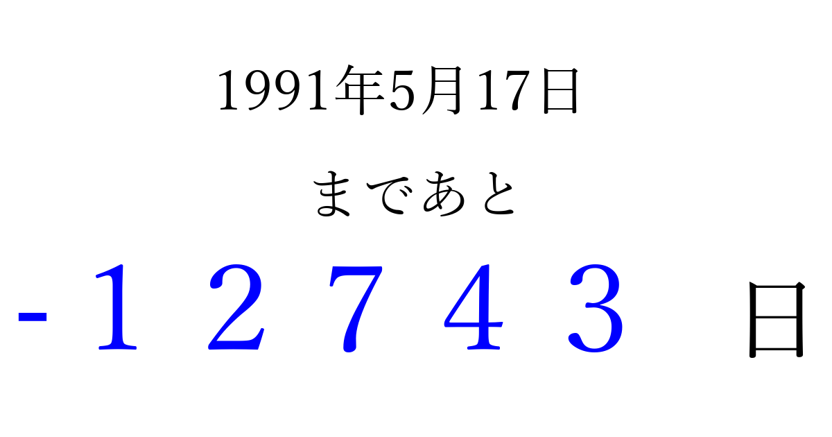1991年5月17日(金)は もう 00000 日過ぎました 追加すると、トップページからすぐ選べるようになります ※2026/04/06現在の結果です。 最新の状態に更新する ↓シェアして、タイムライン上にカウントダウンを表示しよう!↓ 📤 この結果を共有する Tweet シェア Threads Bluesky 別の日付でカウントダウン 1991年5月のカレンダー このページをブックマークに追加すると、いつでもカウントダウンを確認できます。 (PC: Ctrl+D / Mac: ⌘+D) hitome-notes.comでは以下のページも運営しています。 指定日と期間から日付を計算 | ガチャ確率計算・シミュレーション | プライバシー・ポリシー 運営者:Avocado