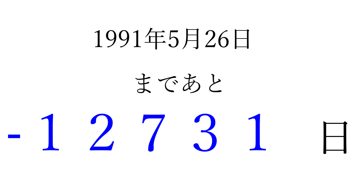 1991年5月26日(日)は もう 00000 日過ぎました 追加すると、トップページからすぐ選べるようになります ※2026/04/03現在の結果です。 最新の状態に更新する ↓シェアして、タイムライン上にカウントダウンを表示しよう!↓ 📤 この結果を共有する Tweet シェア Threads Bluesky 別の日付でカウントダウン 1991年5月のカレンダー このページをブックマークに追加すると、いつでもカウントダウンを確認できます。 (PC: Ctrl+D / Mac: ⌘+D) hitome-notes.comでは以下のページも運営しています。 指定日と期間から日付を計算 | ガチャ確率計算・シミュレーション | プライバシー・ポリシー 運営者:Avocado