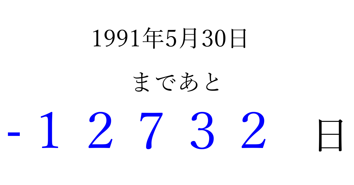 1991年5月30日(木)は もう 00000 日過ぎました 追加すると、トップページからすぐ選べるようになります ※2026/04/08現在の結果です。 最新の状態に更新する ↓シェアして、タイムライン上にカウントダウンを表示しよう!↓ 📤 この結果を共有する Tweet シェア Threads Bluesky 別の日付でカウントダウン 1991年5月のカレンダー このページをブックマークに追加すると、いつでもカウントダウンを確認できます。 (PC: Ctrl+D / Mac: ⌘+D) hitome-notes.comでは以下のページも運営しています。 指定日と期間から日付を計算 | ガチャ確率計算・シミュレーション | プライバシー・ポリシー 運営者:Avocado