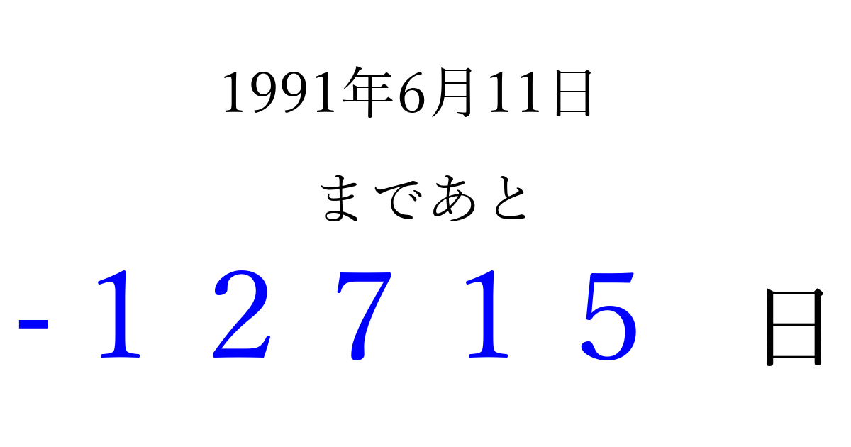 1991年6月11日(火)は もう 00000 日過ぎました 追加すると、トップページからすぐ選べるようになります ※2026/04/03現在の結果です。 最新の状態に更新する ↓シェアして、タイムライン上にカウントダウンを表示しよう!↓ 📤 この結果を共有する Tweet シェア Threads Bluesky 別の日付でカウントダウン 1991年6月のカレンダー このページをブックマークに追加すると、いつでもカウントダウンを確認できます。 (PC: Ctrl+D / Mac: ⌘+D) hitome-notes.comでは以下のページも運営しています。 指定日と期間から日付を計算 | ガチャ確率計算・シミュレーション | プライバシー・ポリシー 運営者:Avocado