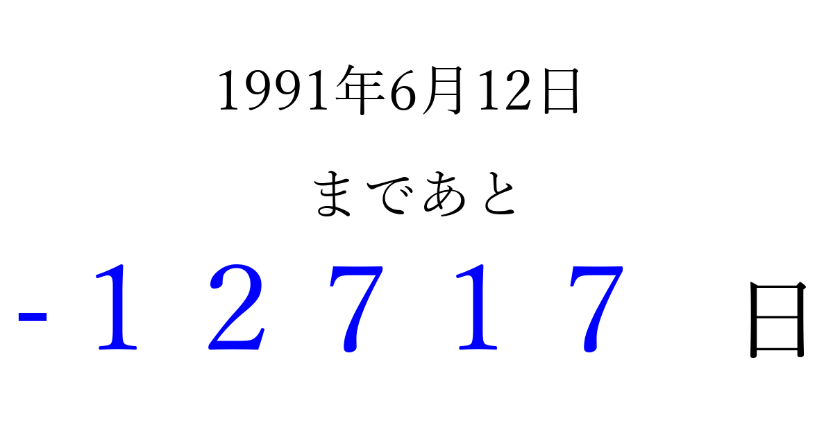1991年6月12日(水)は もう 00000 日過ぎました 追加すると、トップページからすぐ選べるようになります ※2026/04/06現在の結果です。 最新の状態に更新する ↓シェアして、タイムライン上にカウントダウンを表示しよう!↓ 📤 この結果を共有する Tweet シェア Threads Bluesky 別の日付でカウントダウン 1991年6月のカレンダー このページをブックマークに追加すると、いつでもカウントダウンを確認できます。 (PC: Ctrl+D / Mac: ⌘+D) hitome-notes.comでは以下のページも運営しています。 指定日と期間から日付を計算 | ガチャ確率計算・シミュレーション | プライバシー・ポリシー 運営者:Avocado