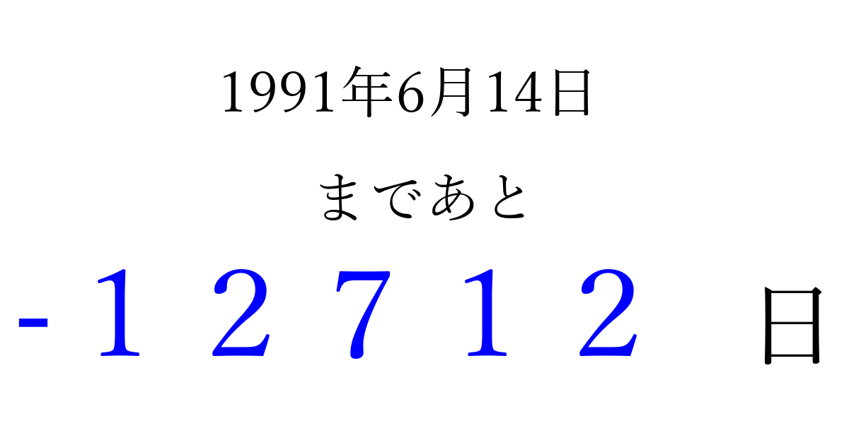 1991年6月14日(金)は もう 00000 日過ぎました 追加すると、トップページからすぐ選べるようになります ※2026/04/03現在の結果です。 最新の状態に更新する ↓シェアして、タイムライン上にカウントダウンを表示しよう!↓ 📤 この結果を共有する Tweet シェア Threads Bluesky 別の日付でカウントダウン 1991年6月のカレンダー このページをブックマークに追加すると、いつでもカウントダウンを確認できます。 (PC: Ctrl+D / Mac: ⌘+D) hitome-notes.comでは以下のページも運営しています。 指定日と期間から日付を計算 | ガチャ確率計算・シミュレーション | プライバシー・ポリシー 運営者:Avocado