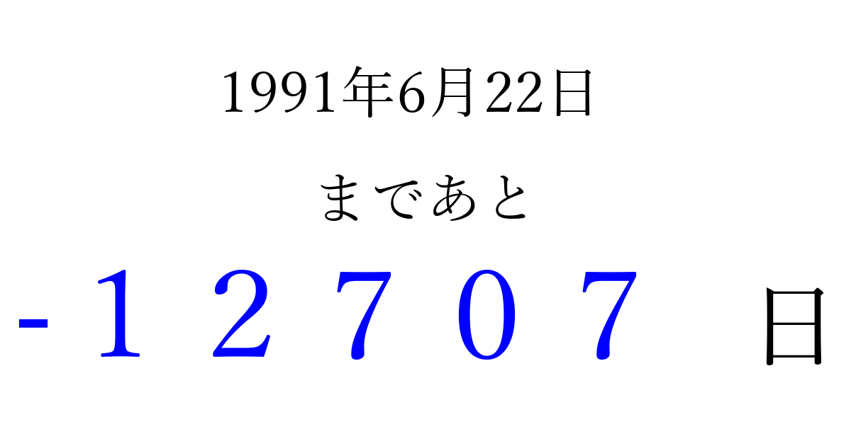 1991年6月22日(土)は もう 00000 日過ぎました 追加すると、トップページからすぐ選べるようになります ※2026/04/06現在の結果です。 最新の状態に更新する ↓シェアして、タイムライン上にカウントダウンを表示しよう!↓ 📤 この結果を共有する Tweet シェア Threads Bluesky 別の日付でカウントダウン 1991年6月のカレンダー このページをブックマークに追加すると、いつでもカウントダウンを確認できます。 (PC: Ctrl+D / Mac: ⌘+D) hitome-notes.comでは以下のページも運営しています。 指定日と期間から日付を計算 | ガチャ確率計算・シミュレーション | プライバシー・ポリシー 運営者:Avocado
