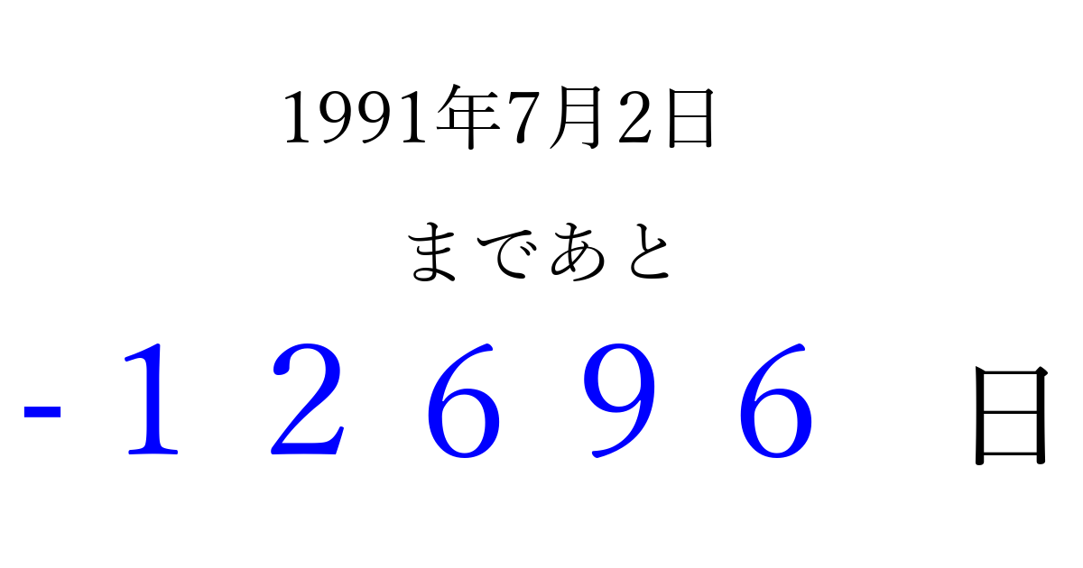 1991年7月2日(火)は もう 00000 日過ぎました 追加すると、トップページからすぐ選べるようになります ※2026/04/05現在の結果です。 最新の状態に更新する ↓シェアして、タイムライン上にカウントダウンを表示しよう!↓ 📤 この結果を共有する Tweet シェア Threads Bluesky 別の日付でカウントダウン 1991年7月のカレンダー このページをブックマークに追加すると、いつでもカウントダウンを確認できます。 (PC: Ctrl+D / Mac: ⌘+D) hitome-notes.comでは以下のページも運営しています。 指定日と期間から日付を計算 | ガチャ確率計算・シミュレーション | プライバシー・ポリシー 運営者:Avocado