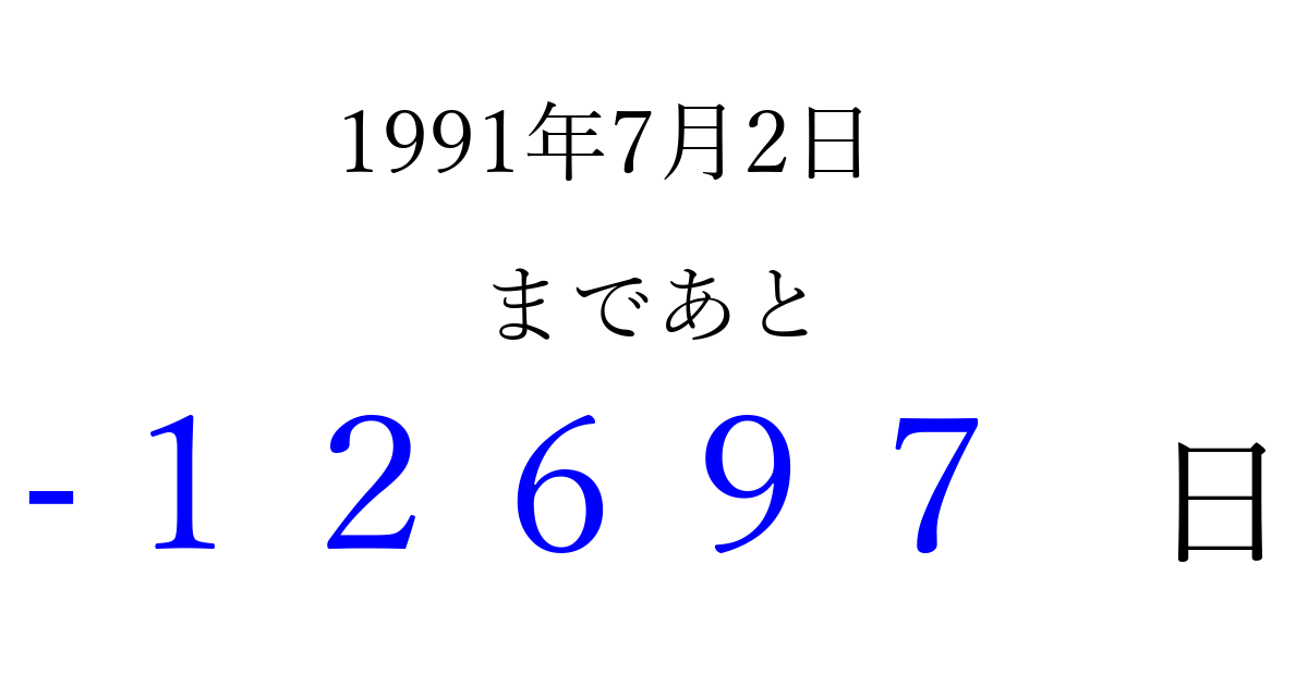 1991年7月2日(火)は もう 00000 日過ぎました 追加すると、トップページからすぐ選べるようになります ※2026/04/06現在の結果です。 最新の状態に更新する ↓シェアして、タイムライン上にカウントダウンを表示しよう!↓ 📤 この結果を共有する Tweet シェア Threads Bluesky 別の日付でカウントダウン 1991年7月のカレンダー このページをブックマークに追加すると、いつでもカウントダウンを確認できます。 (PC: Ctrl+D / Mac: ⌘+D) hitome-notes.comでは以下のページも運営しています。 指定日と期間から日付を計算 | ガチャ確率計算・シミュレーション | プライバシー・ポリシー 運営者:Avocado