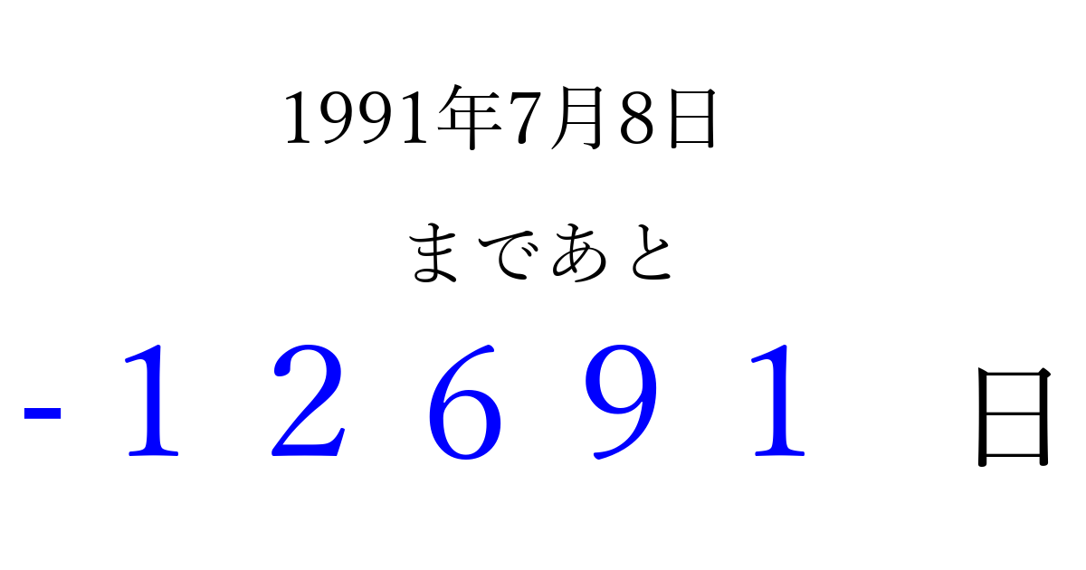 1991年7月8日(月)は もう 00000 日過ぎました 追加すると、トップページからすぐ選べるようになります ※2026/04/06現在の結果です。 最新の状態に更新する ↓シェアして、タイムライン上にカウントダウンを表示しよう!↓ 📤 この結果を共有する Tweet シェア Threads Bluesky 別の日付でカウントダウン 1991年7月のカレンダー このページをブックマークに追加すると、いつでもカウントダウンを確認できます。 (PC: Ctrl+D / Mac: ⌘+D) hitome-notes.comでは以下のページも運営しています。 指定日と期間から日付を計算 | ガチャ確率計算・シミュレーション | プライバシー・ポリシー 運営者:Avocado