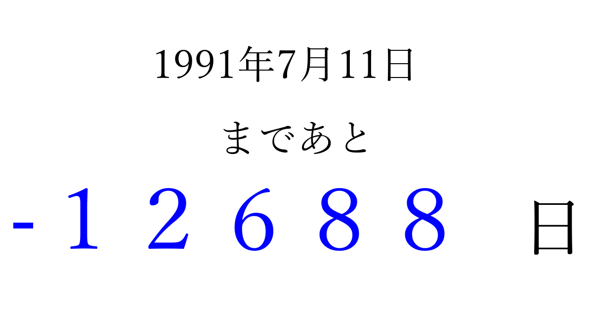 1991年7月11日(木)は もう 00000 日過ぎました 追加すると、トップページからすぐ選べるようになります ※2026/04/06現在の結果です。 最新の状態に更新する ↓シェアして、タイムライン上にカウントダウンを表示しよう!↓ 📤 この結果を共有する Tweet シェア Threads Bluesky 別の日付でカウントダウン 1991年7月のカレンダー このページをブックマークに追加すると、いつでもカウントダウンを確認できます。 (PC: Ctrl+D / Mac: ⌘+D) hitome-notes.comでは以下のページも運営しています。 指定日と期間から日付を計算 | ガチャ確率計算・シミュレーション | プライバシー・ポリシー 運営者:Avocado