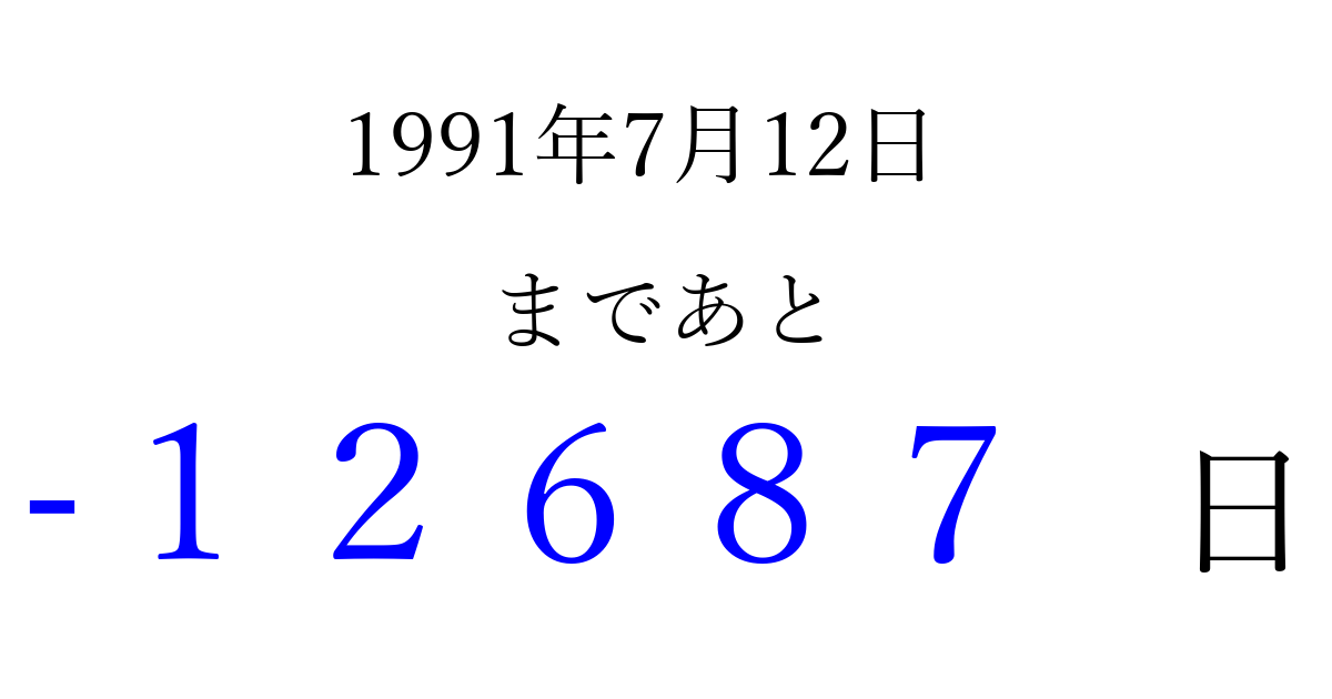 1991年7月12日(金)は もう 00000 日過ぎました 追加すると、トップページからすぐ選べるようになります ※2026/04/06現在の結果です。 最新の状態に更新する ↓シェアして、タイムライン上にカウントダウンを表示しよう!↓ 📤 この結果を共有する Tweet シェア Threads Bluesky 別の日付でカウントダウン 1991年7月のカレンダー このページをブックマークに追加すると、いつでもカウントダウンを確認できます。 (PC: Ctrl+D / Mac: ⌘+D) hitome-notes.comでは以下のページも運営しています。 指定日と期間から日付を計算 | ガチャ確率計算・シミュレーション | プライバシー・ポリシー 運営者:Avocado