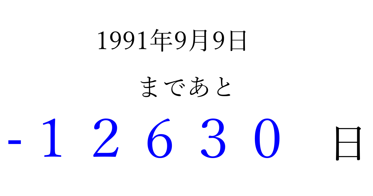 1991年9月9日(月)は もう 00000 日過ぎました 追加すると、トップページからすぐ選べるようになります ※2026/04/08現在の結果です。 最新の状態に更新する ↓シェアして、タイムライン上にカウントダウンを表示しよう!↓ 📤 この結果を共有する Tweet シェア Threads Bluesky 別の日付でカウントダウン 1991年9月のカレンダー このページをブックマークに追加すると、いつでもカウントダウンを確認できます。 (PC: Ctrl+D / Mac: ⌘+D) hitome-notes.comでは以下のページも運営しています。 指定日と期間から日付を計算 | ガチャ確率計算・シミュレーション | プライバシー・ポリシー 運営者:Avocado