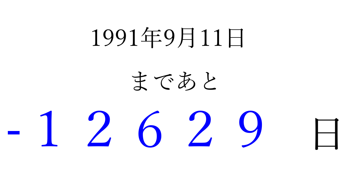1991年9月11日(水)は もう 00000 日過ぎました 追加すると、トップページからすぐ選べるようになります ※2026/04/09現在の結果です。 最新の状態に更新する ↓シェアして、タイムライン上にカウントダウンを表示しよう!↓ 📤 この結果を共有する Tweet シェア Threads Bluesky 別の日付でカウントダウン 1991年9月のカレンダー このページをブックマークに追加すると、いつでもカウントダウンを確認できます。 (PC: Ctrl+D / Mac: ⌘+D) hitome-notes.comでは以下のページも運営しています。 指定日と期間から日付を計算 | ガチャ確率計算・シミュレーション | プライバシー・ポリシー 運営者:Avocado