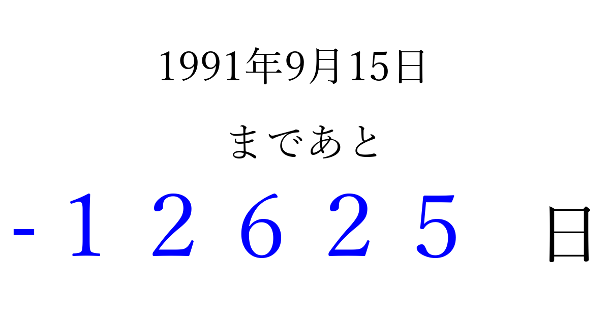1991年9月15日(日)は もう 00000 日過ぎました 追加すると、トップページからすぐ選べるようになります ※2026/04/09現在の結果です。 最新の状態に更新する ↓シェアして、タイムライン上にカウントダウンを表示しよう!↓ 📤 この結果を共有する Tweet シェア Threads Bluesky 別の日付でカウントダウン 1991年9月のカレンダー このページをブックマークに追加すると、いつでもカウントダウンを確認できます。 (PC: Ctrl+D / Mac: ⌘+D) hitome-notes.comでは以下のページも運営しています。 指定日と期間から日付を計算 | ガチャ確率計算・シミュレーション | プライバシー・ポリシー 運営者:Avocado