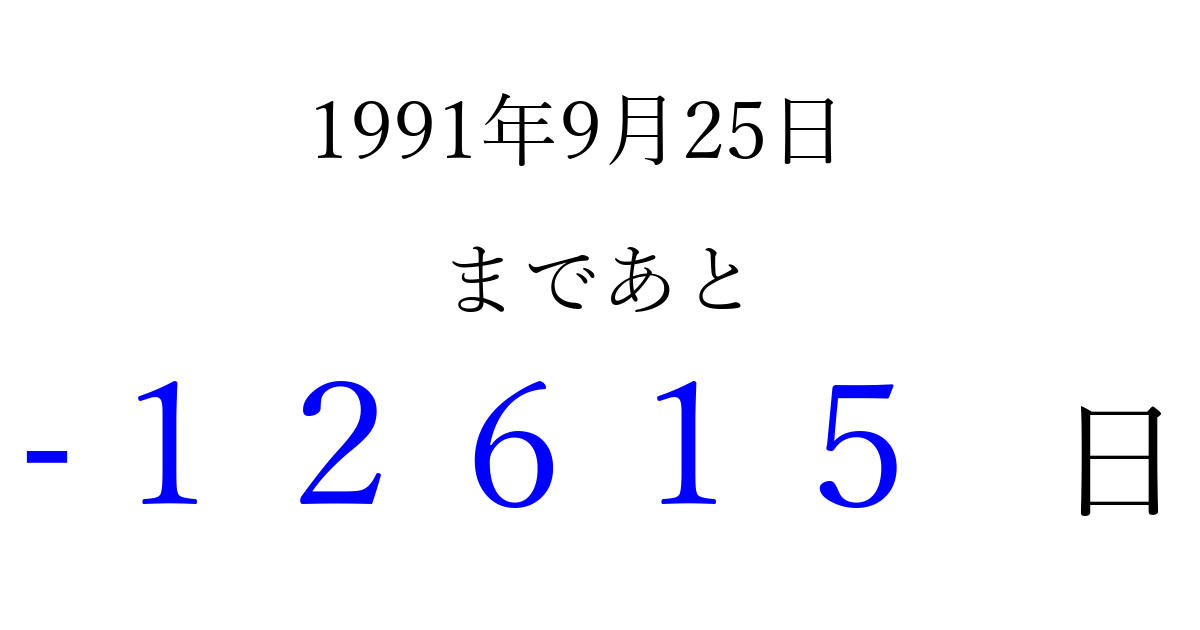 1991年9月25日(水)は もう 00000 日過ぎました 追加すると、トップページからすぐ選べるようになります ※2026/04/09現在の結果です。 最新の状態に更新する ↓シェアして、タイムライン上にカウントダウンを表示しよう!↓ 📤 この結果を共有する Tweet シェア Threads Bluesky 別の日付でカウントダウン 1991年9月のカレンダー このページをブックマークに追加すると、いつでもカウントダウンを確認できます。 (PC: Ctrl+D / Mac: ⌘+D) hitome-notes.comでは以下のページも運営しています。 指定日と期間から日付を計算 | ガチャ確率計算・シミュレーション | プライバシー・ポリシー 運営者:Avocado