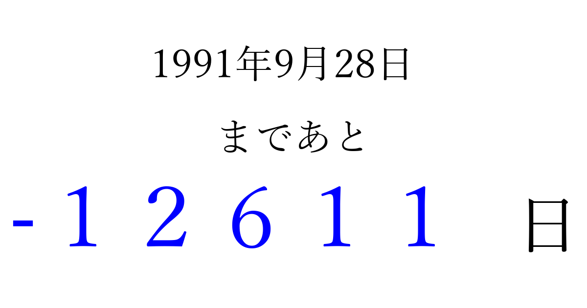 1991年9月28日(土)は もう 00000 日過ぎました 追加すると、トップページからすぐ選べるようになります ※2026/04/08現在の結果です。 最新の状態に更新する ↓シェアして、タイムライン上にカウントダウンを表示しよう!↓ 📤 この結果を共有する Tweet シェア Threads Bluesky 別の日付でカウントダウン 1991年9月のカレンダー このページをブックマークに追加すると、いつでもカウントダウンを確認できます。 (PC: Ctrl+D / Mac: ⌘+D) hitome-notes.comでは以下のページも運営しています。 指定日と期間から日付を計算 | ガチャ確率計算・シミュレーション | プライバシー・ポリシー 運営者:Avocado