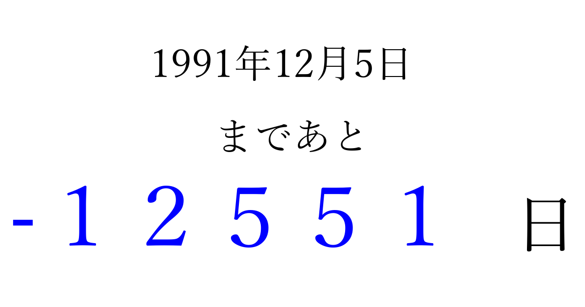 1991年12月5日(木)は もう 00000 日過ぎました 追加すると、トップページからすぐ選べるようになります ※2026/04/16現在の結果です。 最新の状態に更新する ↓シェアして、タイムライン上にカウントダウンを表示しよう!↓ 📤 この結果を共有する Tweet シェア Threads Bluesky 別の日付でカウントダウン 1991年12月のカレンダー このページをブックマークに追加すると、いつでもカウントダウンを確認できます。 (PC: Ctrl+D / Mac: ⌘+D) hitome-notes.comでは以下のページも運営しています。 指定日と期間から日付を計算 | ガチャ確率計算・シミュレーション | プライバシー・ポリシー 運営者:Avocado