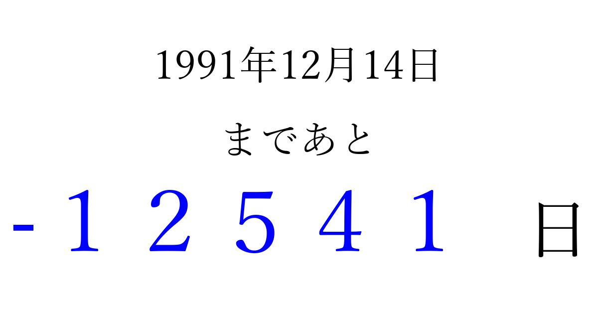 1991年12月14日(土)は もう 00000 日過ぎました 追加すると、トップページからすぐ選べるようになります ※2026/04/15現在の結果です。 最新の状態に更新する ↓シェアして、タイムライン上にカウントダウンを表示しよう!↓ 📤 この結果を共有する Tweet シェア Threads Bluesky 別の日付でカウントダウン 1991年12月のカレンダー このページをブックマークに追加すると、いつでもカウントダウンを確認できます。 (PC: Ctrl+D / Mac: ⌘+D) hitome-notes.comでは以下のページも運営しています。 指定日と期間から日付を計算 | ガチャ確率計算・シミュレーション | プライバシー・ポリシー 運営者:Avocado