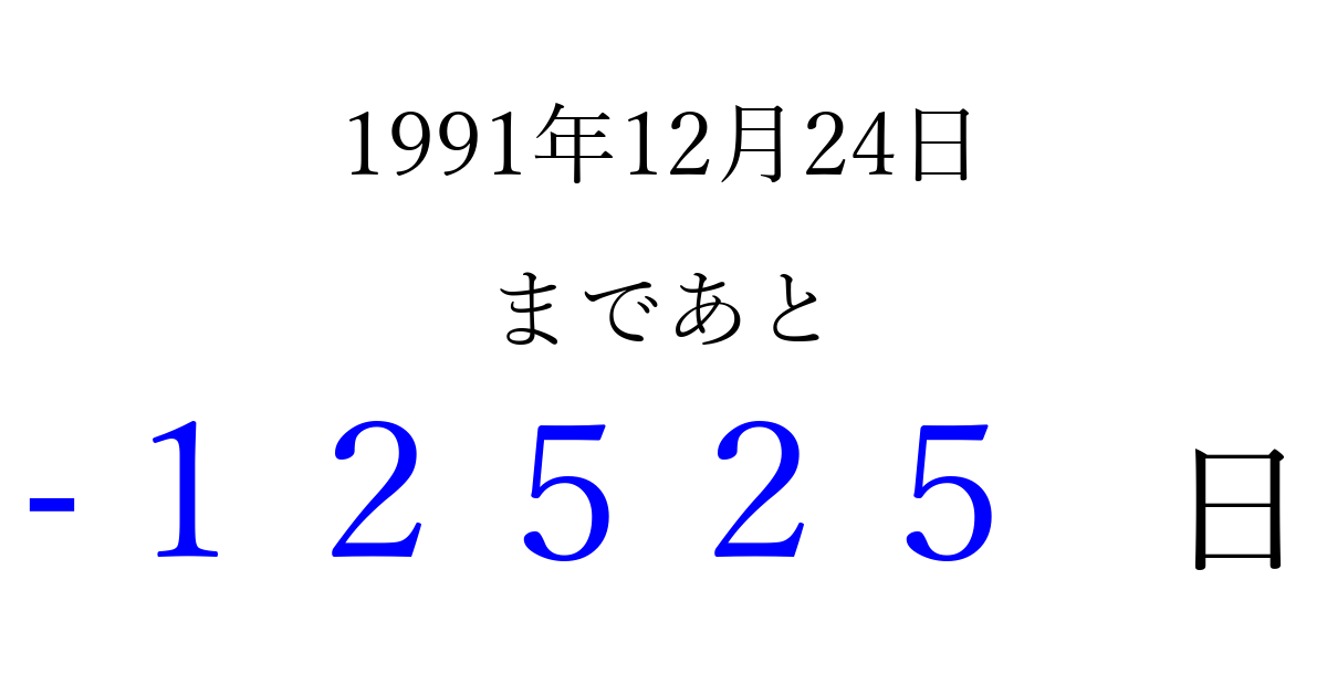1991年12月24日(火)は もう 00000 日過ぎました 追加すると、トップページからすぐ選べるようになります ※2026/04/09現在の結果です。 最新の状態に更新する ↓シェアして、タイムライン上にカウントダウンを表示しよう!↓ 📤 この結果を共有する Tweet シェア Threads Bluesky 別の日付でカウントダウン 1991年12月のカレンダー このページをブックマークに追加すると、いつでもカウントダウンを確認できます。 (PC: Ctrl+D / Mac: ⌘+D) hitome-notes.comでは以下のページも運営しています。 指定日と期間から日付を計算 | ガチャ確率計算・シミュレーション | プライバシー・ポリシー 運営者:Avocado