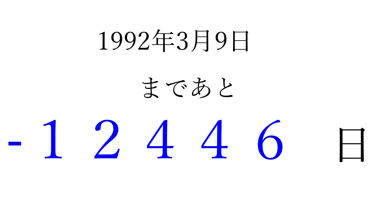 1992年3月9日(月)は もう 00000 日過ぎました 追加すると、トップページからすぐ選べるようになります ※2026/04/06現在の結果です。 最新の状態に更新する ↓シェアして、タイムライン上にカウントダウンを表示しよう!↓ 📤 この結果を共有する Tweet シェア Threads Bluesky 別の日付でカウントダウン 1992年3月のカレンダー このページをブックマークに追加すると、いつでもカウントダウンを確認できます。 (PC: Ctrl+D / Mac: ⌘+D) hitome-notes.comでは以下のページも運営しています。 指定日と期間から日付を計算 | ガチャ確率計算・シミュレーション | プライバシー・ポリシー 運営者:Avocado