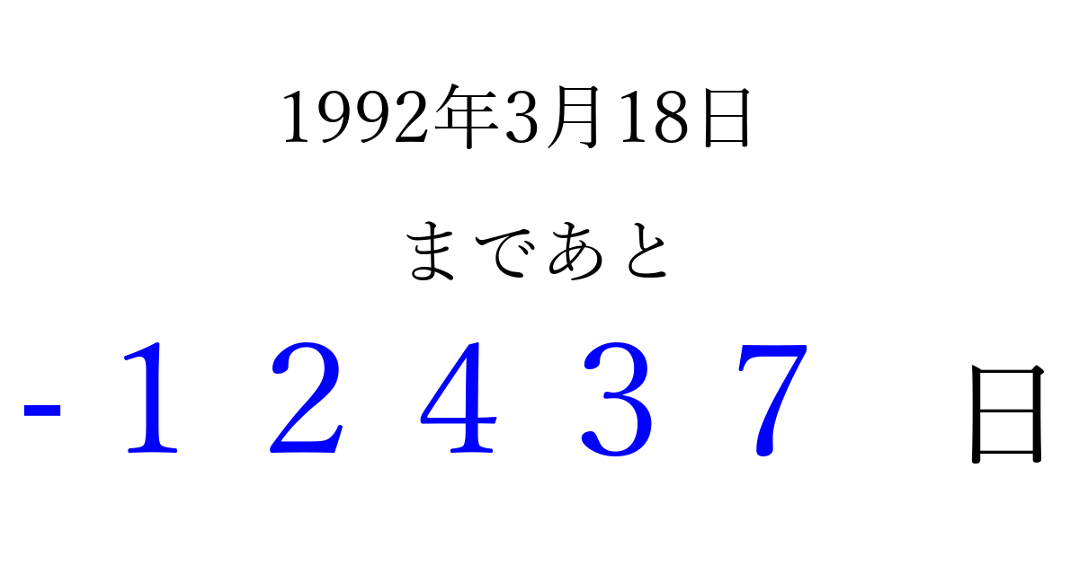 1992年3月18日(水)は もう 00000 日過ぎました 追加すると、トップページからすぐ選べるようになります ※2026/04/06現在の結果です。 最新の状態に更新する ↓シェアして、タイムライン上にカウントダウンを表示しよう!↓ 📤 この結果を共有する Tweet シェア Threads Bluesky 別の日付でカウントダウン 1992年3月のカレンダー このページをブックマークに追加すると、いつでもカウントダウンを確認できます。 (PC: Ctrl+D / Mac: ⌘+D) hitome-notes.comでは以下のページも運営しています。 指定日と期間から日付を計算 | ガチャ確率計算・シミュレーション | プライバシー・ポリシー 運営者:Avocado