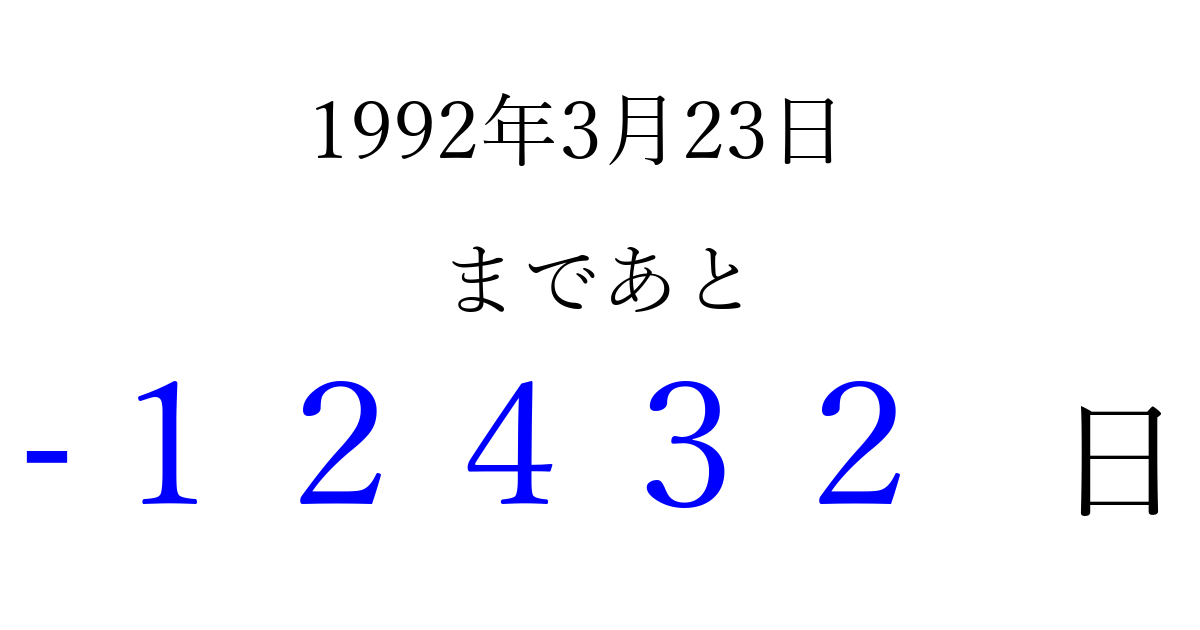 1992年3月23日(月)は もう 00000 日過ぎました 追加すると、トップページからすぐ選べるようになります ※2026/04/06現在の結果です。 最新の状態に更新する ↓シェアして、タイムライン上にカウントダウンを表示しよう!↓ 📤 この結果を共有する Tweet シェア Threads Bluesky 別の日付でカウントダウン 1992年3月のカレンダー このページをブックマークに追加すると、いつでもカウントダウンを確認できます。 (PC: Ctrl+D / Mac: ⌘+D) hitome-notes.comでは以下のページも運営しています。 指定日と期間から日付を計算 | ガチャ確率計算・シミュレーション | プライバシー・ポリシー 運営者:Avocado