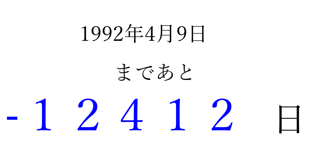 1992年4月9日(木)は もう 00000 日過ぎました 追加すると、トップページからすぐ選べるようになります ※2026/04/03現在の結果です。 最新の状態に更新する ↓シェアして、タイムライン上にカウントダウンを表示しよう!↓ 📤 この結果を共有する Tweet シェア Threads Bluesky 別の日付でカウントダウン 1992年4月のカレンダー このページをブックマークに追加すると、いつでもカウントダウンを確認できます。 (PC: Ctrl+D / Mac: ⌘+D) hitome-notes.comでは以下のページも運営しています。 指定日と期間から日付を計算 | ガチャ確率計算・シミュレーション | プライバシー・ポリシー 運営者:Avocado