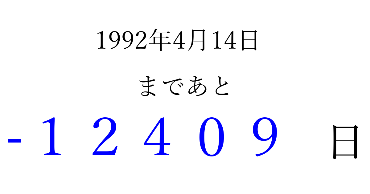 1992年4月14日(火)は もう 00000 日過ぎました 追加すると、トップページからすぐ選べるようになります ※2026/04/05現在の結果です。 最新の状態に更新する ↓シェアして、タイムライン上にカウントダウンを表示しよう!↓ 📤 この結果を共有する Tweet シェア Threads Bluesky 別の日付でカウントダウン 1992年4月のカレンダー このページをブックマークに追加すると、いつでもカウントダウンを確認できます。 (PC: Ctrl+D / Mac: ⌘+D) hitome-notes.comでは以下のページも運営しています。 指定日と期間から日付を計算 | ガチャ確率計算・シミュレーション | プライバシー・ポリシー 運営者:Avocado