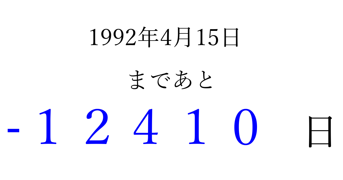 1992年4月15日(水)は もう 00000 日過ぎました 追加すると、トップページからすぐ選べるようになります ※2026/04/07現在の結果です。 最新の状態に更新する ↓シェアして、タイムライン上にカウントダウンを表示しよう!↓ 📤 この結果を共有する Tweet シェア Threads Bluesky 別の日付でカウントダウン 1992年4月のカレンダー このページをブックマークに追加すると、いつでもカウントダウンを確認できます。 (PC: Ctrl+D / Mac: ⌘+D) hitome-notes.comでは以下のページも運営しています。 指定日と期間から日付を計算 | ガチャ確率計算・シミュレーション | プライバシー・ポリシー 運営者:Avocado
