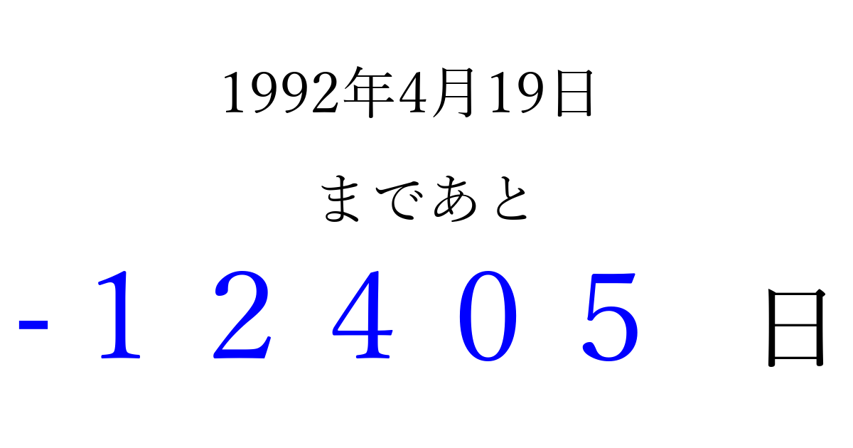1992年4月19日(日)は もう 00000 日過ぎました 追加すると、トップページからすぐ選べるようになります ※2026/04/06現在の結果です。 最新の状態に更新する ↓シェアして、タイムライン上にカウントダウンを表示しよう!↓ 📤 この結果を共有する Tweet シェア Threads Bluesky 別の日付でカウントダウン 1992年4月のカレンダー このページをブックマークに追加すると、いつでもカウントダウンを確認できます。 (PC: Ctrl+D / Mac: ⌘+D) hitome-notes.comでは以下のページも運営しています。 指定日と期間から日付を計算 | ガチャ確率計算・シミュレーション | プライバシー・ポリシー 運営者:Avocado