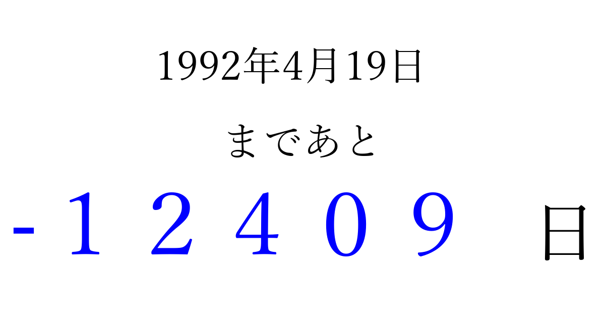 1992年4月19日(日)は もう 00000 日過ぎました 追加すると、トップページからすぐ選べるようになります ※2026/04/10現在の結果です。 最新の状態に更新する ↓シェアして、タイムライン上にカウントダウンを表示しよう!↓ 📤 この結果を共有する Tweet シェア Threads Bluesky 別の日付でカウントダウン 1992年4月のカレンダー このページをブックマークに追加すると、いつでもカウントダウンを確認できます。 (PC: Ctrl+D / Mac: ⌘+D) hitome-notes.comでは以下のページも運営しています。 指定日と期間から日付を計算 | ガチャ確率計算・シミュレーション | プライバシー・ポリシー 運営者:Avocado