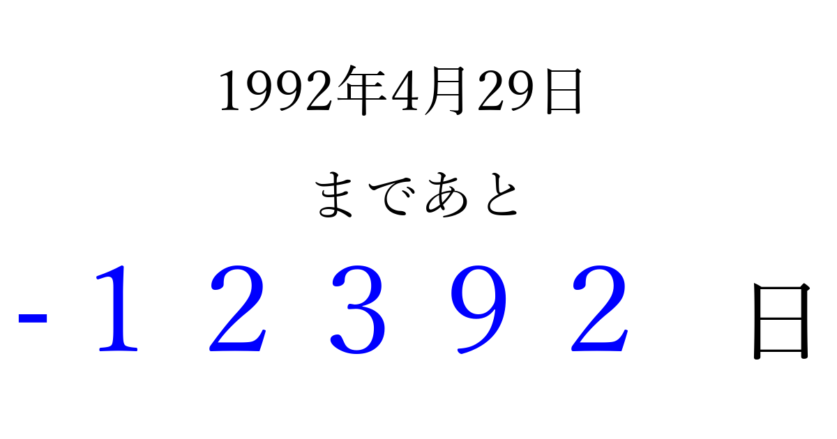 1992年4月29日(水)は もう 00000 日過ぎました 追加すると、トップページからすぐ選べるようになります ※2026/04/03現在の結果です。 最新の状態に更新する ↓シェアして、タイムライン上にカウントダウンを表示しよう!↓ 📤 この結果を共有する Tweet シェア Threads Bluesky 別の日付でカウントダウン 1992年4月のカレンダー このページをブックマークに追加すると、いつでもカウントダウンを確認できます。 (PC: Ctrl+D / Mac: ⌘+D) hitome-notes.comでは以下のページも運営しています。 指定日と期間から日付を計算 | ガチャ確率計算・シミュレーション | プライバシー・ポリシー 運営者:Avocado