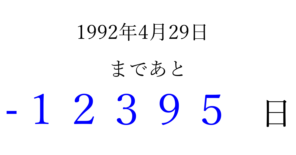 1992年4月29日(水)は もう 00000 日過ぎました 追加すると、トップページからすぐ選べるようになります ※2026/04/06現在の結果です。 最新の状態に更新する ↓シェアして、タイムライン上にカウントダウンを表示しよう!↓ 📤 この結果を共有する Tweet シェア Threads Bluesky 別の日付でカウントダウン 1992年4月のカレンダー このページをブックマークに追加すると、いつでもカウントダウンを確認できます。 (PC: Ctrl+D / Mac: ⌘+D) hitome-notes.comでは以下のページも運営しています。 指定日と期間から日付を計算 | ガチャ確率計算・シミュレーション | プライバシー・ポリシー 運営者:Avocado
