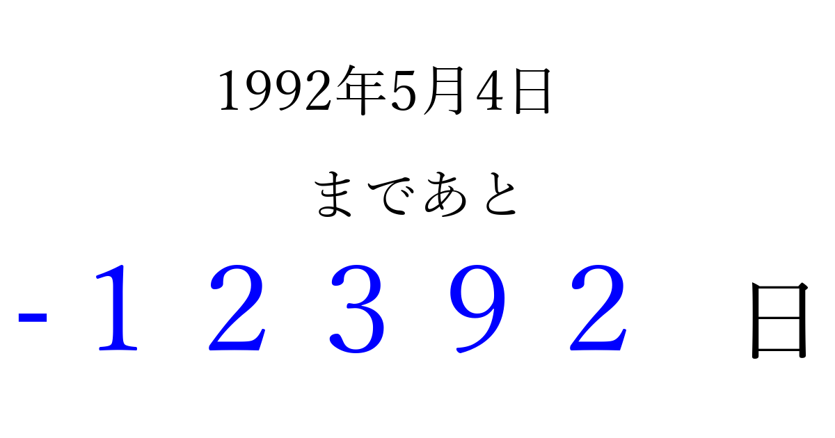 1992年5月4日(月)は もう 00000 日過ぎました 追加すると、トップページからすぐ選べるようになります ※2026/04/08現在の結果です。 最新の状態に更新する ↓シェアして、タイムライン上にカウントダウンを表示しよう!↓ 📤 この結果を共有する Tweet シェア Threads Bluesky 別の日付でカウントダウン 1992年5月のカレンダー このページをブックマークに追加すると、いつでもカウントダウンを確認できます。 (PC: Ctrl+D / Mac: ⌘+D) hitome-notes.comでは以下のページも運営しています。 指定日と期間から日付を計算 | ガチャ確率計算・シミュレーション | プライバシー・ポリシー 運営者:Avocado
