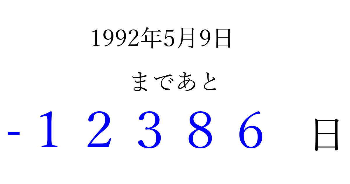 1992年5月9日(土)は もう 00000 日過ぎました 追加すると、トップページからすぐ選べるようになります ※2026/04/07現在の結果です。 最新の状態に更新する ↓シェアして、タイムライン上にカウントダウンを表示しよう!↓ 📤 この結果を共有する Tweet シェア Threads Bluesky 別の日付でカウントダウン 1992年5月のカレンダー このページをブックマークに追加すると、いつでもカウントダウンを確認できます。 (PC: Ctrl+D / Mac: ⌘+D) hitome-notes.comでは以下のページも運営しています。 指定日と期間から日付を計算 | ガチャ確率計算・シミュレーション | プライバシー・ポリシー 運営者:Avocado