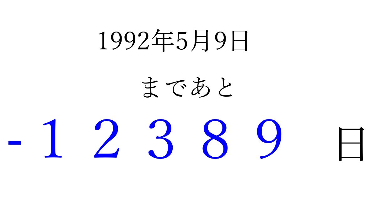 1992年5月9日(土)は もう 00000 日過ぎました 追加すると、トップページからすぐ選べるようになります ※2026/04/10現在の結果です。 最新の状態に更新する ↓シェアして、タイムライン上にカウントダウンを表示しよう!↓ 📤 この結果を共有する Tweet シェア Threads Bluesky 別の日付でカウントダウン 1992年5月のカレンダー このページをブックマークに追加すると、いつでもカウントダウンを確認できます。 (PC: Ctrl+D / Mac: ⌘+D) hitome-notes.comでは以下のページも運営しています。 指定日と期間から日付を計算 | ガチャ確率計算・シミュレーション | プライバシー・ポリシー 運営者:Avocado